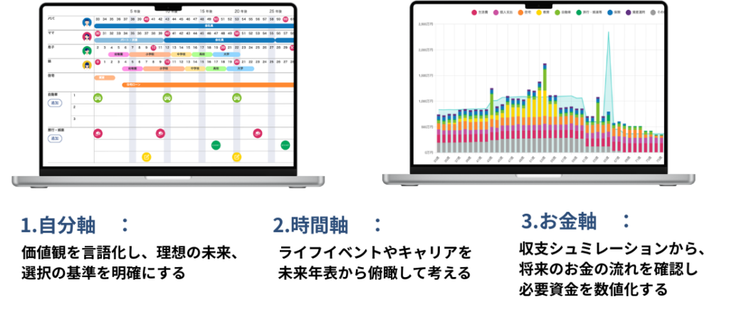 未来のライフイベントやお金の流れを人生設計から見える化して実行までトータルサポート。